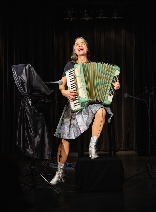 Die Autorin, Performancekünstlerin und Musikerin singt eigene Lieder zum Akkordeon und liest aus ihrem sprachspielerischen fiktiven Brandenburger Brief – Bettine von Arnim an Achim von Armin.